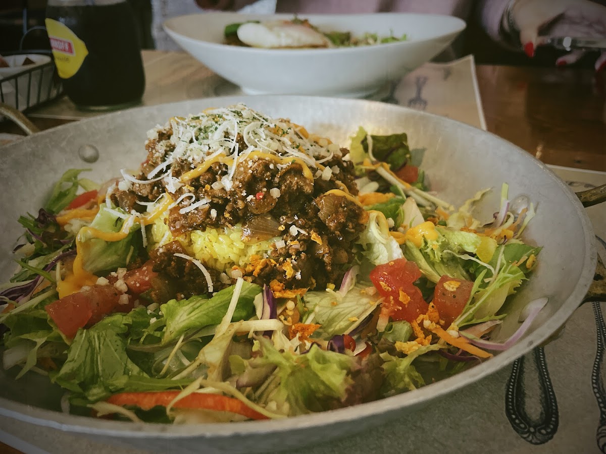 At Tsubame Cafe, we celebrate the vibrant flavors of Japanese-style comfort food with a twist. One of the standout dishes is the Taco Rice, a tantalizing blend of savory ground meat and onion, sautéed with a unique mix of South American spices, served atop a fluffy bed of rice and fresh salad. It's crowned with a sprinkle of cheese that melts into the dish, creating an irresistible finish. For those who crave a little heat, don't forget to ask for their homemade salsa sauce to elevate your meal! Priced affordably at JP¥650, this dish promises both taste and value.